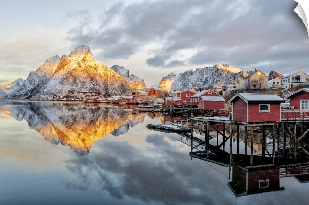<p>Traditional red Rorbu cabins at dawn, Reine Bay, Nordland, Lofoten Islands, Norway</p>