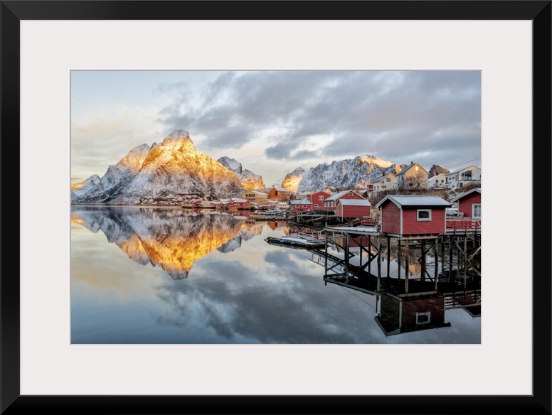 <p>Traditional red Rorbu cabins at dawn, Reine Bay, Nordland, Lofoten Islands, Norway</p>