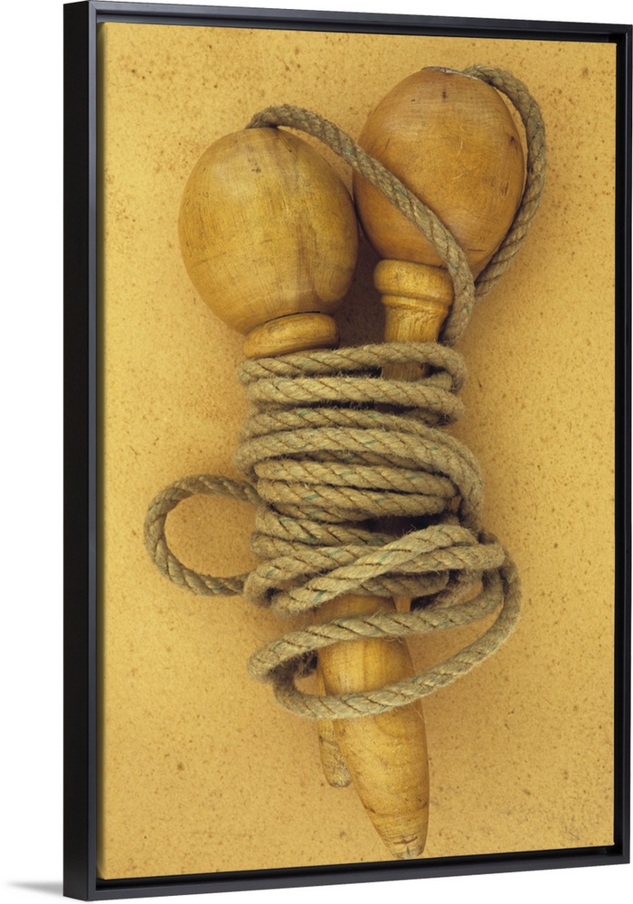 <p>Close up of traditional skipping rope with carved and turned wooden handles lying on antique paper</p>