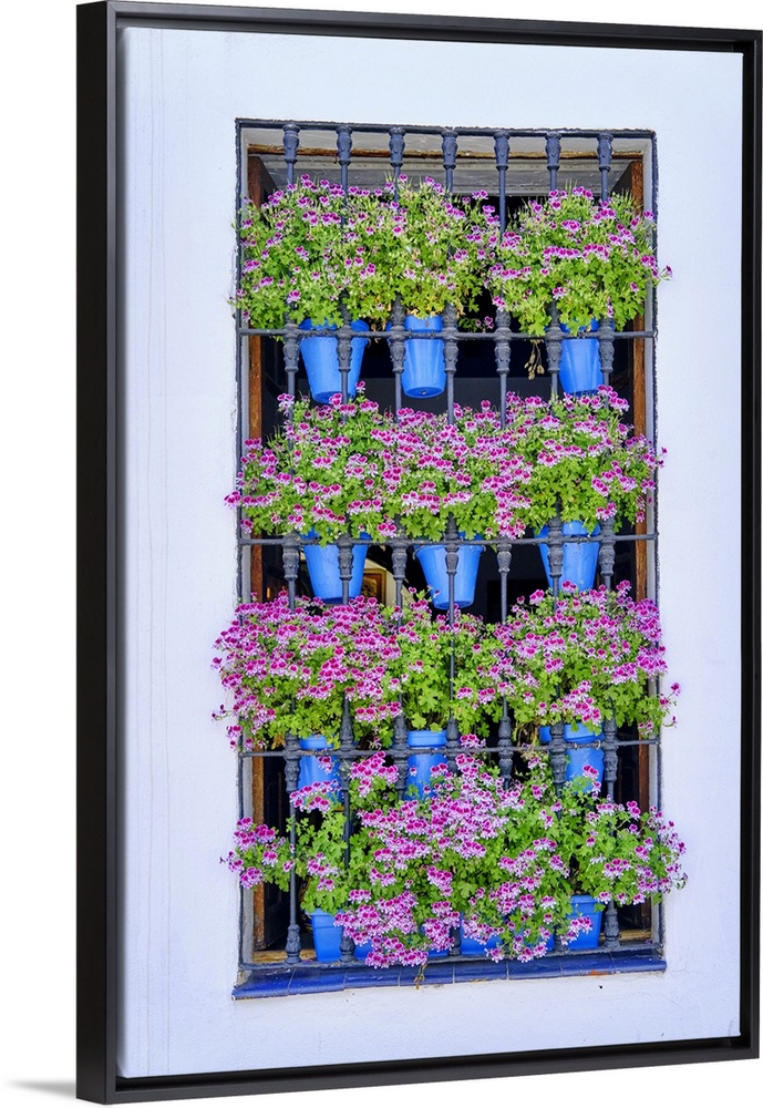 <p>Traditional windows in the old town of Cordoba, during the Fiesta de los Patios in May. A UNESCO World Heritage Site. Andalucia, Spain</p>