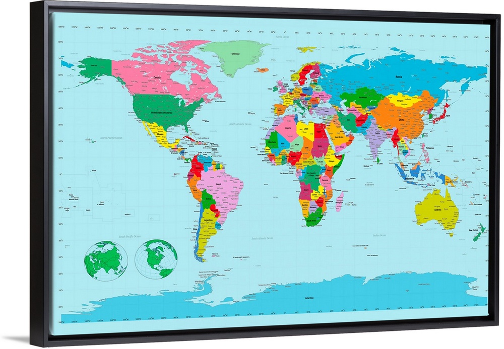 <p>Large, horizontal wall hanging of the world map on a solid blue background.</p>