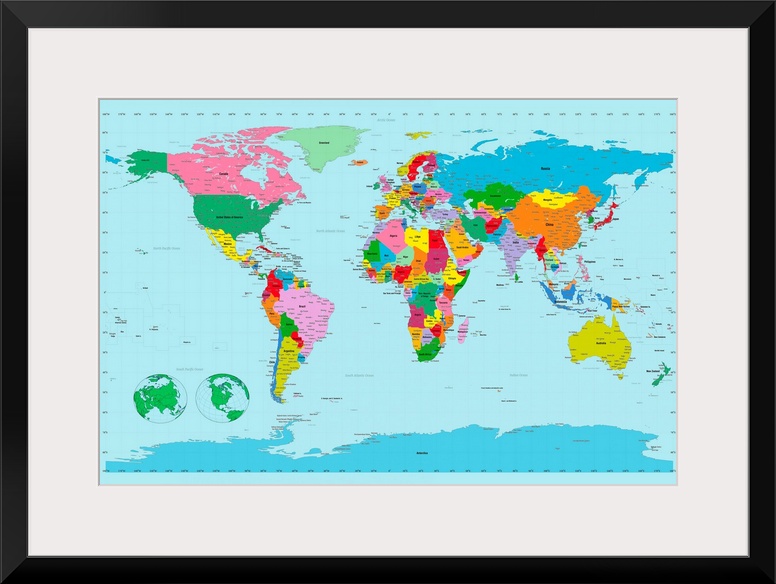 <p>Large, horizontal wall hanging of the world map on a solid blue background.</p>