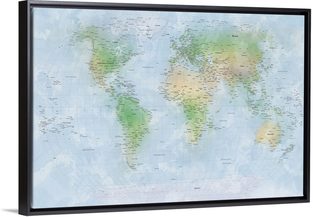 <p>Traditional world map with countries, cities, and oceans labeled with topography colors.</p>
