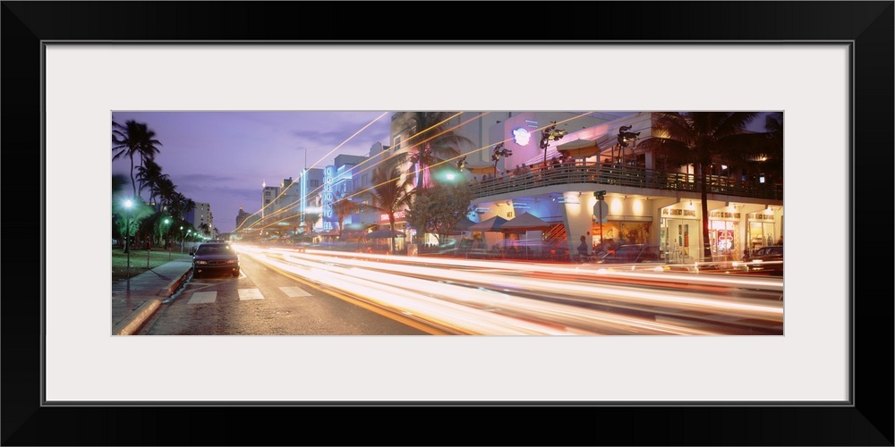 <p>Lights from a car streak by on a busy street in Miami. Buildings line the strip on the right side.</p>