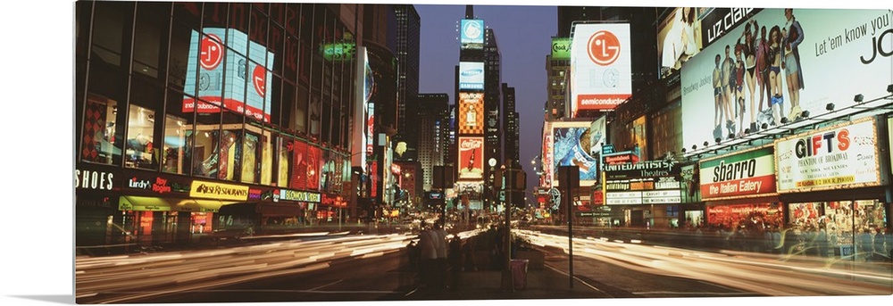 <p>Giant landscape photograph of the lights of Times Square in downtown New York City at night, the street lit with light trails from passing cars.</p>