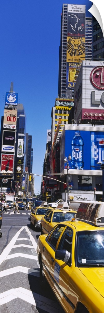 <p>Vertical panoramic photograph taken of a busy street in Times Square.</p>