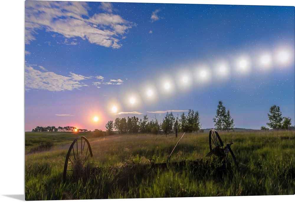 <p>Trail of the waning gibbous moon tracking low across the sky in Alberta, Canada.</p>