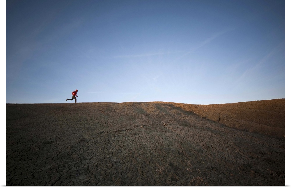 <p>a man wearing a red shirt runs across the abstract sonoran desert mesas of white mesa in the ojito wilderness area, near san ysidro, new mexico. warm sunset light splashes the scenery of the landscape beneath a blue sky touched with streaking clouds. horizonal composition with copy space.</p>