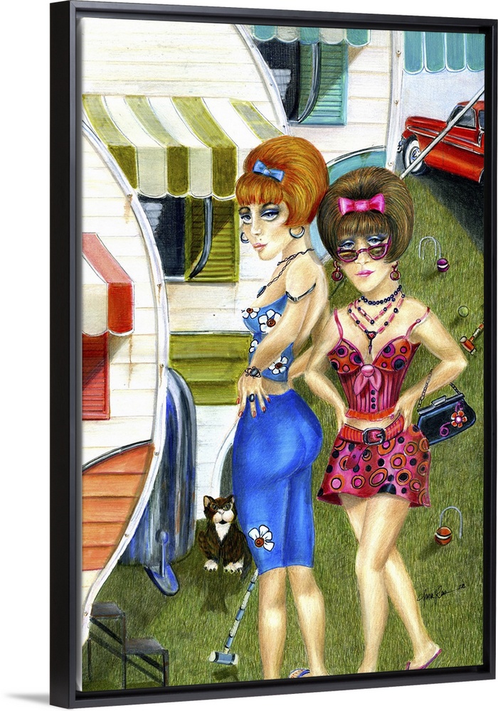 <p>Contemporary painting of two woman standing in front of a trailer with a cat.</p>