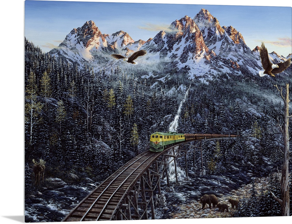 <p>train with mountains in background, eagles flying over head, bears walking.snow</p>