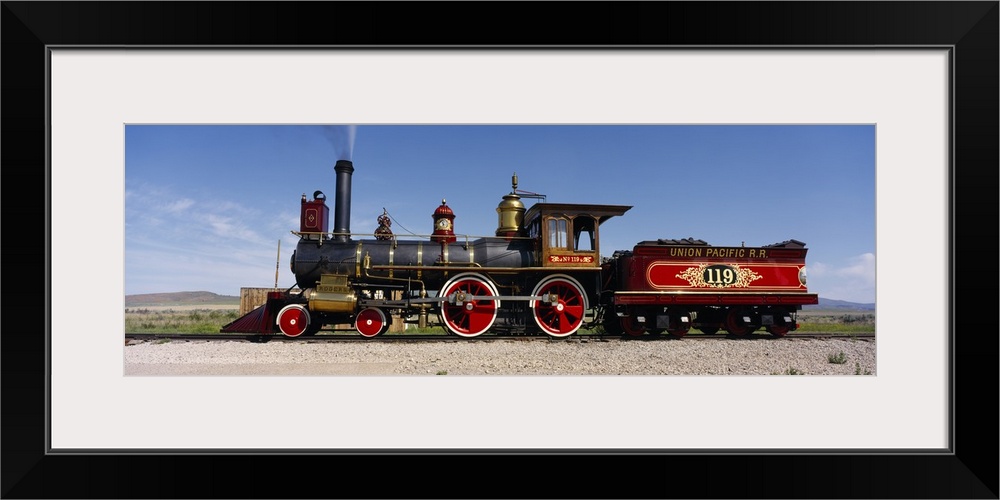 <p>Panoramic photograph of vintage train car on railway.</p>