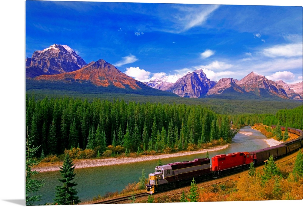 <p>Big canvas photo art of a train running through the Canadian countryside with forests surrounding it and rugged mountains in the background.</p>