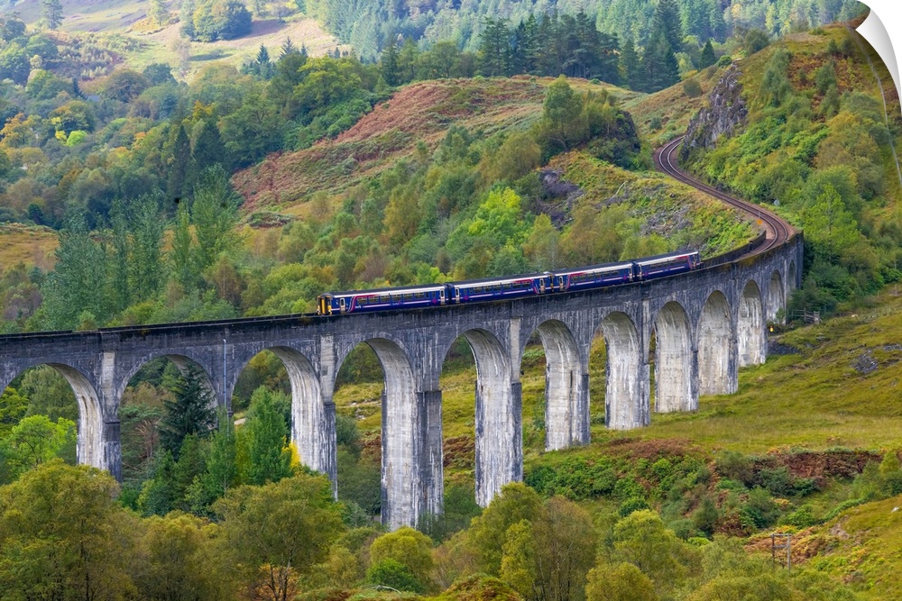 <p>Train on the Glenfinnan Railway Viaduct, part of the West Highland Line, Glenfinnan, Loch Shiel, Highlands, Scotland, United Kingdom, Europe</p>