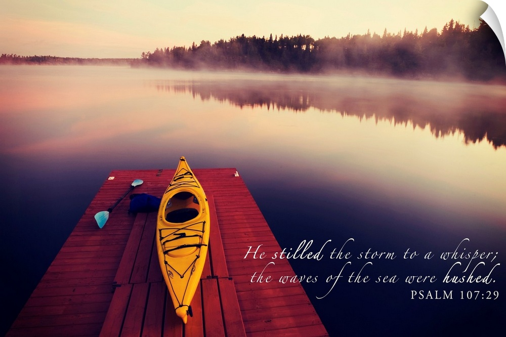 <p>Image Of A Tranquil Lake And Fog With A Kayak On A Wooden Dock And Scripture From Psalm 107:29</p>