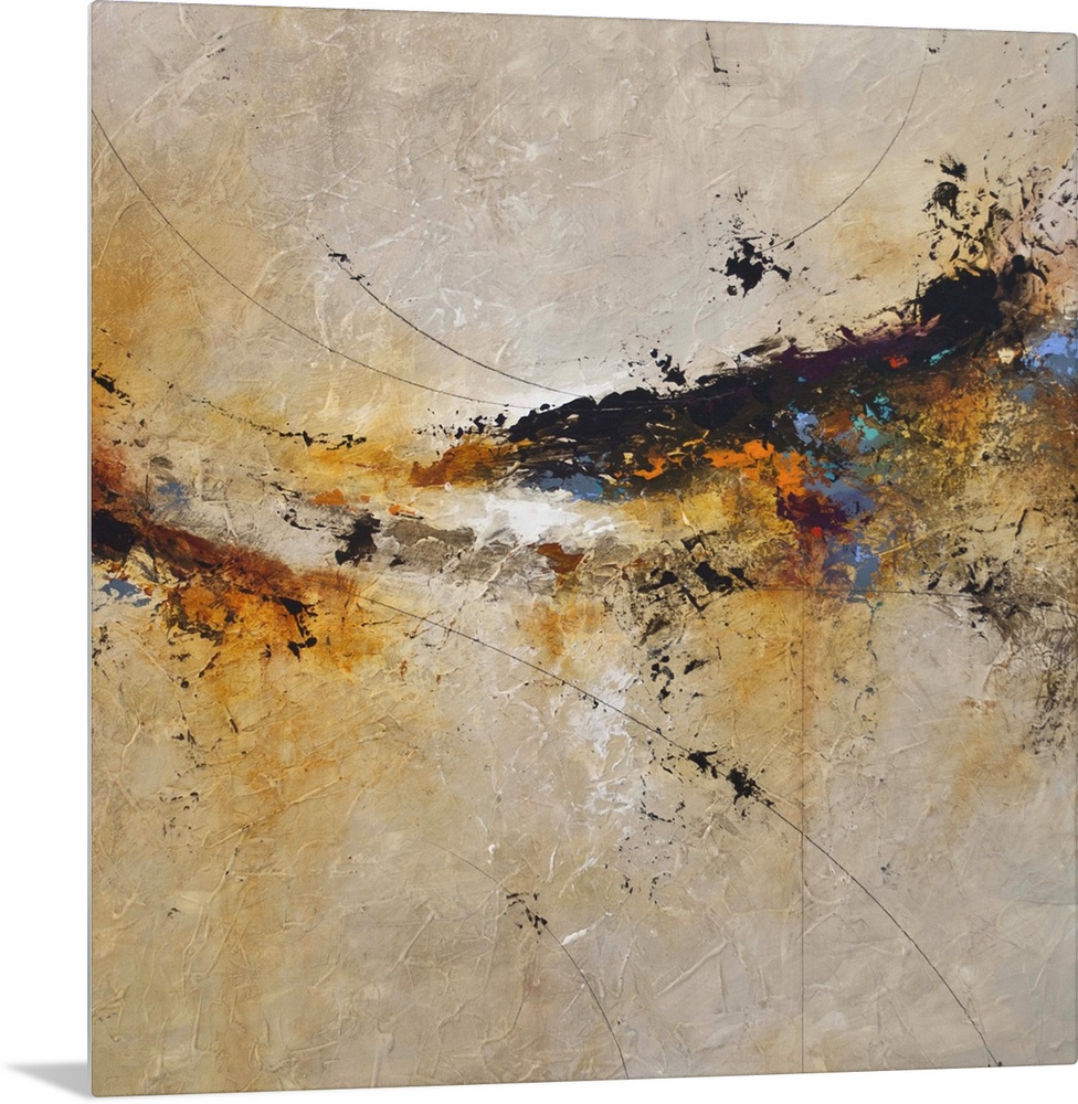 <p>Contemporary abstract painting in beige, blue, black, and amber.</p>