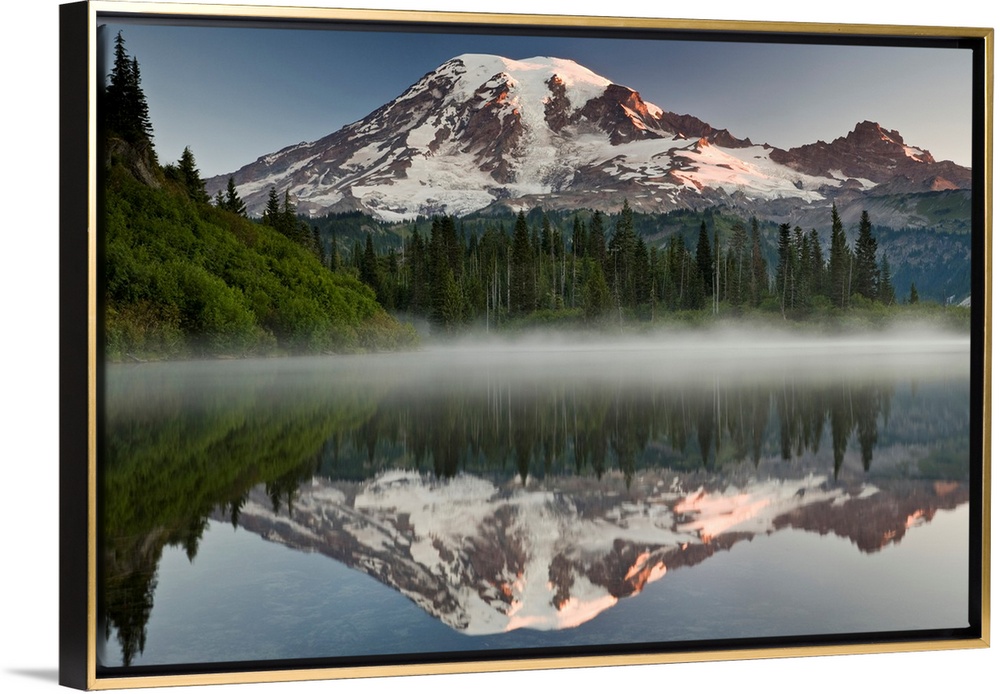 <p>Big photograph shows the great size of snow-covered Mount Rainier in the background reflecting over one of the many lakes in Mount Rainier National Park within Washington. Hovering over top of the lake, a small amount of fog can be seen near the shore's edge.</p>
