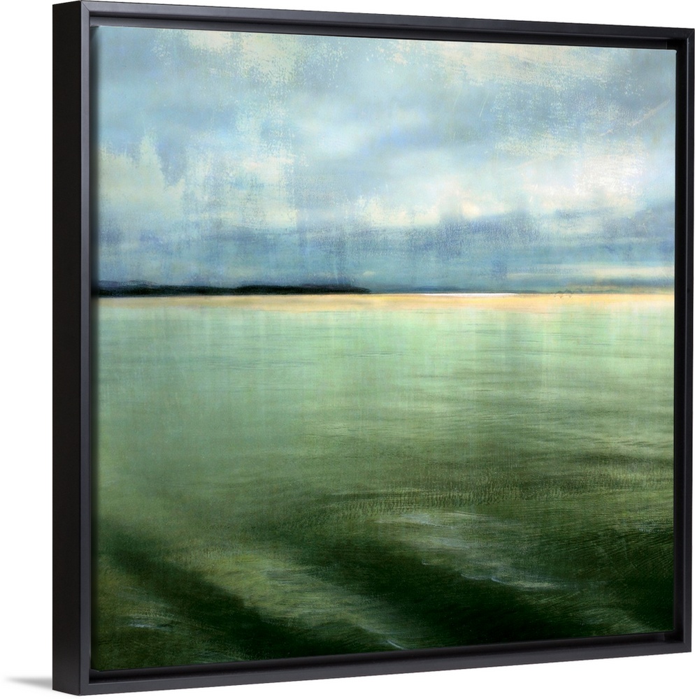 <p>Big square canvas art shows calm waters in the foreground slowly hitting the beach in the background on a sunny day.</p>