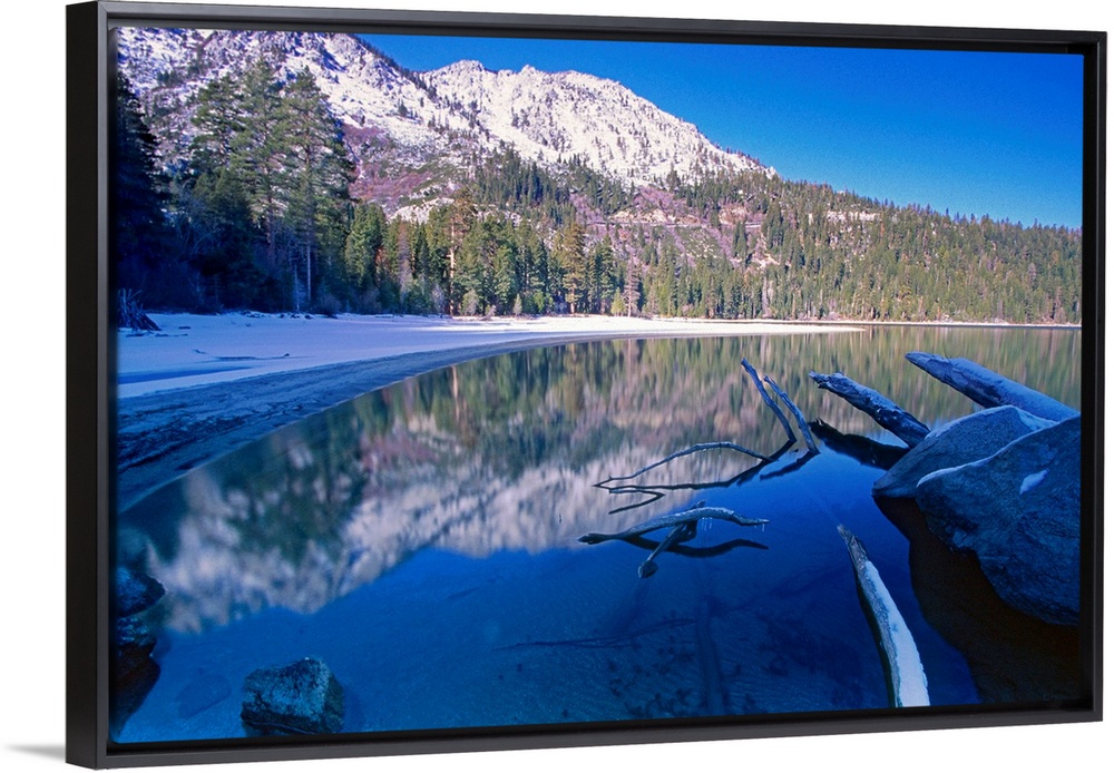 <p>Landscape, big photograph of the still waters of Emerald Bay at Lake Tahoe, California, surrounded by a snow covered landscape of trees and mountains in the background.</p>