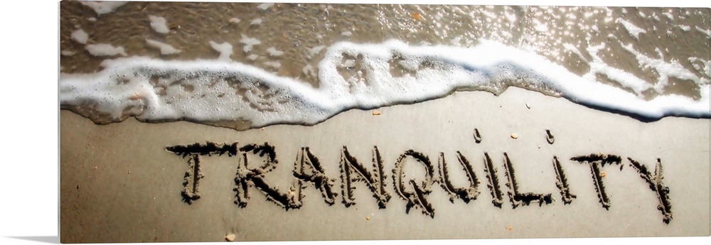 <p>The word "Tranquility" drawn in the wet sand near ocean water.</p>