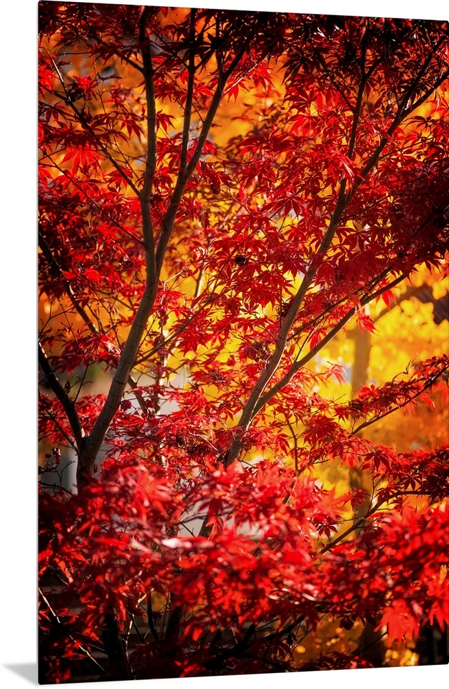 <p>Branches full of red and yellow leaves in a forest in autumn.</p>