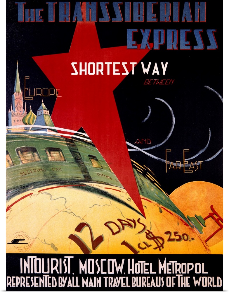 <p>Portrait vintage advertisement for the Trans Siberian Express, of a speeding train curving over a rolling landscape, surrounded by the far East and Europe.</p>