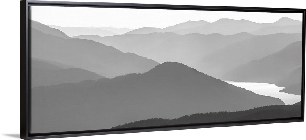 <p>Black and white image of many layers of mountain range in the Monashee Mountains, Canada.</p>