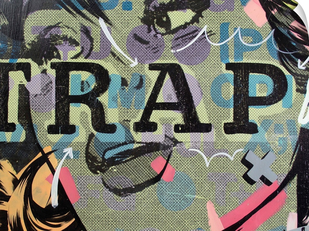 <p>Pop art composed of comic illustrations and bold text, reminiscent of Lichtenstein, of the word "TRAP" in all caps across a woman's face.</p>