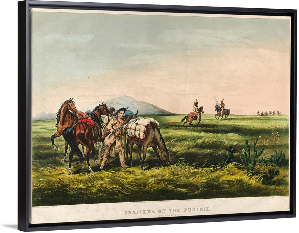 <p>Trappers on the Prairie / Peace or War?, 1866 (originally colour lithograph) by Currier, N. (1813-88) and Ives, J.M. (1824-95)</p>