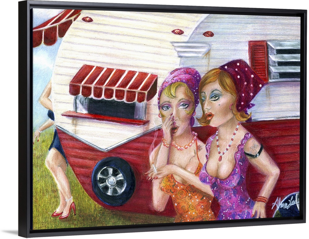 <p>Contemporary painting of two woman talking in front of a trailer with a person hiding behind it.</p>