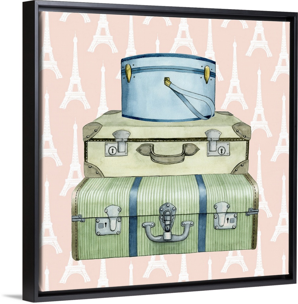 <p>Art print of three vintage suitcases on a pastel pink background with an Eiffel Tower pattern.</p>