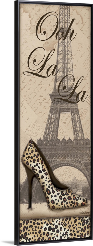 <p>Tall and skinny decor with an illustration of the Eiffel Tower in the background and a cheetah print high heel shoe on top with the phrase "Ooh La La"</p>