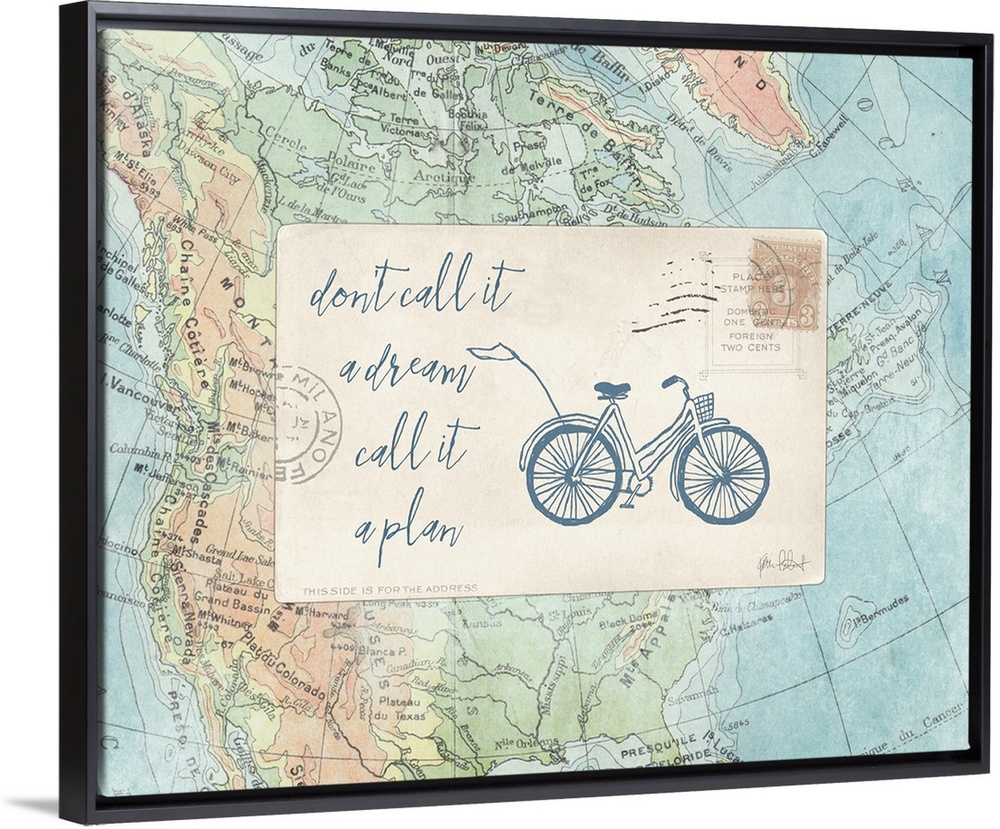 <p>"Don't Call it a Dream Call it a Plan" with a bicycle drawn in blue on a postcard on top of a map.</p>