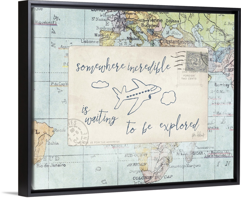 <p>"Somewhere Incredible is Waiting to be Explored" with an airplane drawn in blue on a postcard on top of a map.</p>