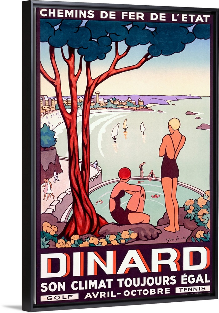 <p>Portrait vintage advertisement for the French State Railway, destination is Dinard. Two people in bathing suits rest beneath a tree on a hill that overlooks the water and the city, people below are walking and there are several boats in the water.</p>
