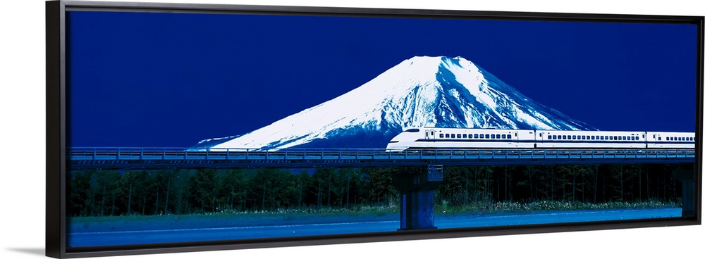 <p>Panoramic photo on canvas of a train going across a bridge above water with a snowy mountain the background.</p>