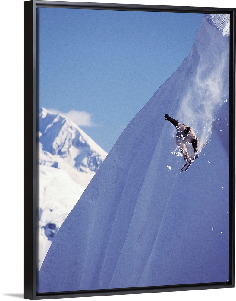 <p>Travis Parker snowboarding down a steep mountainside at Whistler, British Columbia, Canada.</p>