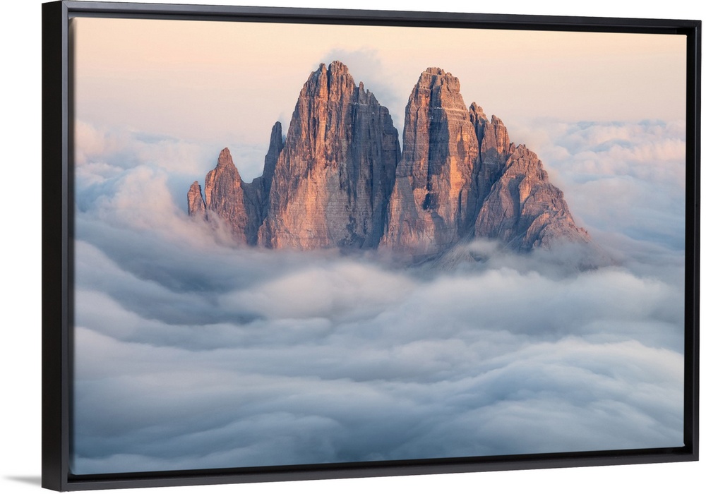 <p>Tre Cime di Lavaredo emerging from the clouds, Sexten Dolomites, South Tyrol, Bolzano, Italy, Europe</p>