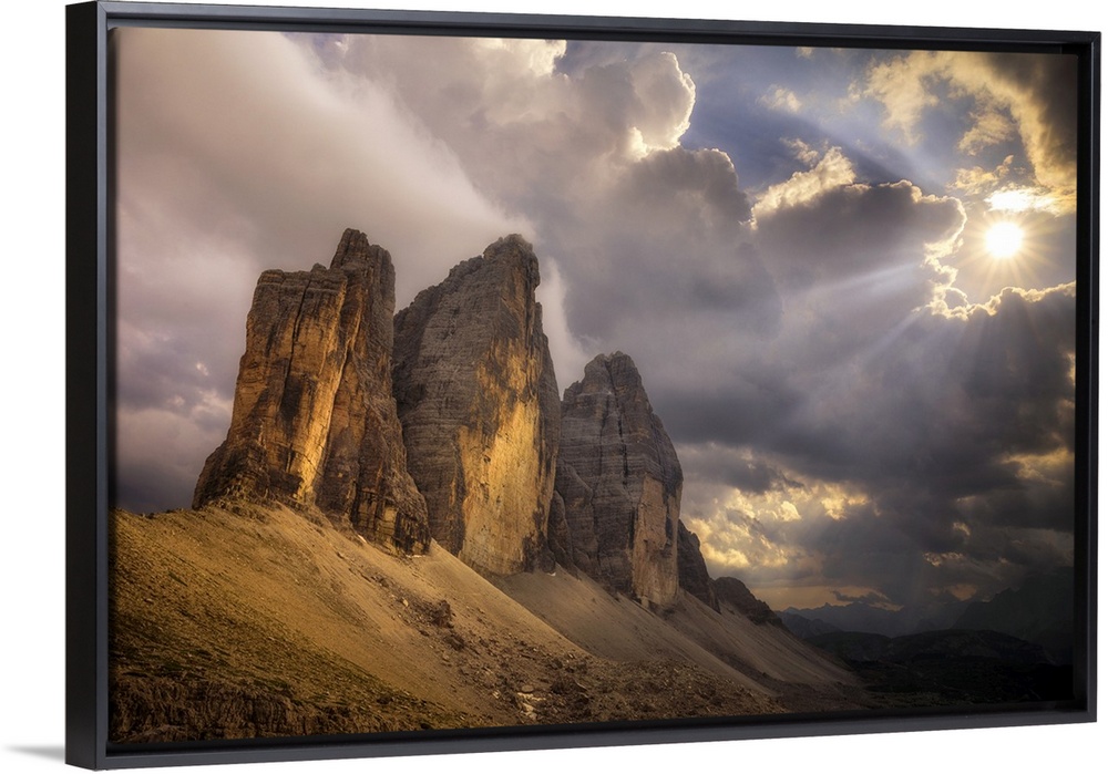 <p>Europe, Italy, Dolomites. Tre Cime di Lavaredo peaks at sunset. Credit: Jim Nilsen</p>