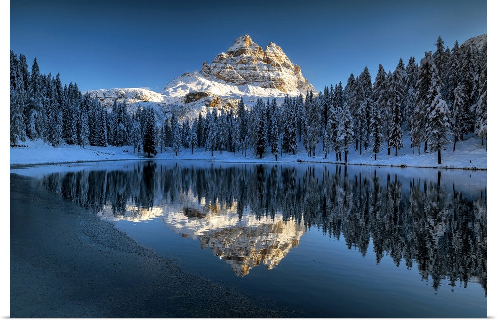 <p>Tre Cime di Lavaredo Reflecting in Lake Antorno, Belluno Province, Veneto, Dolomites, Italy</p>