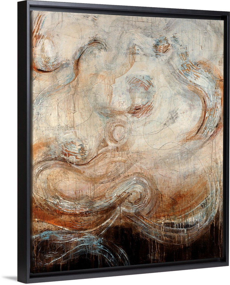 <p>Abstract artwork of large swirls on a harsh background. Paint leaks down the print.</p>