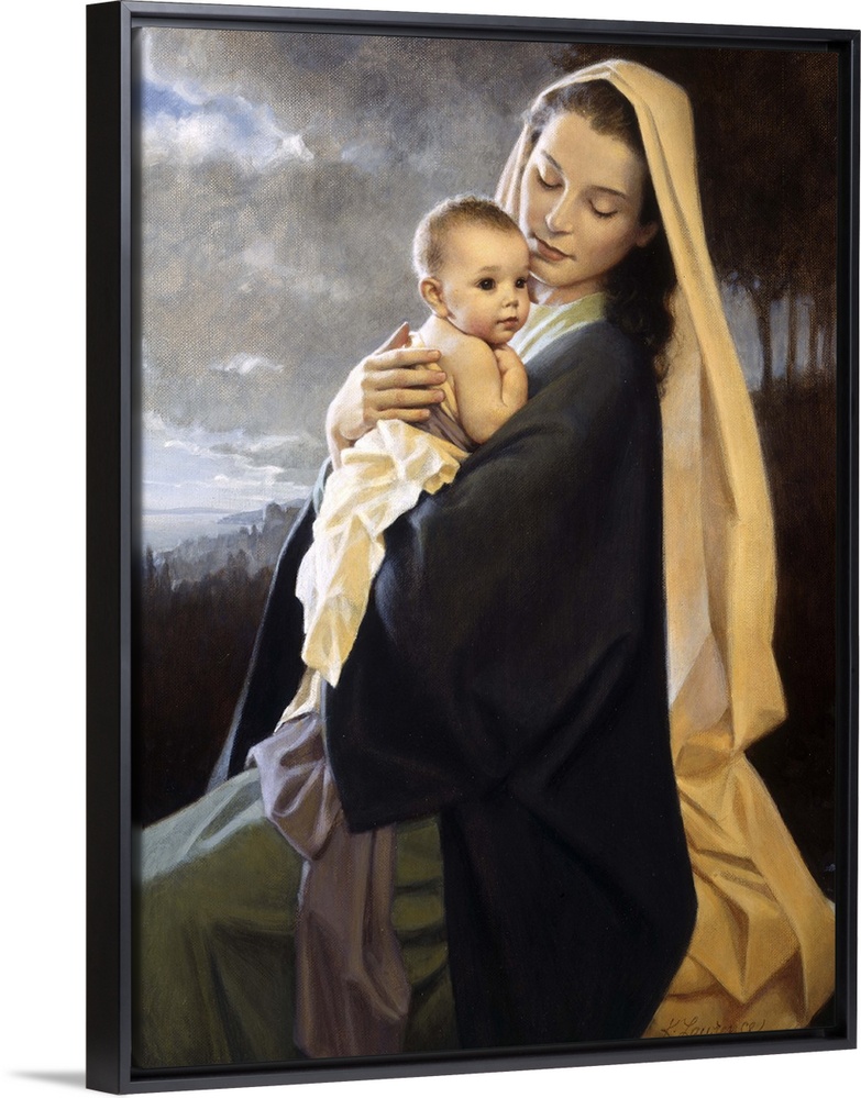 <p>Portrait painting on a large wall hanging of Mary holding onto baby Jesus as He looks over her shoulder. A cloudy sky and dark landscape fill the background.</p>