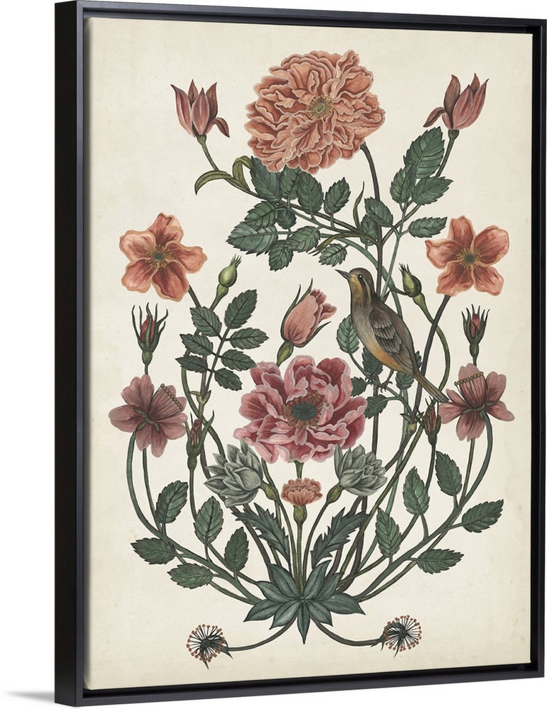 <p>This vintage-like illustration demonstrates the beauty of nature and its gifts by featuring a garden bird perched on an ever-growing flower.</p>
