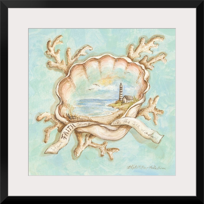 <p>Square painting of a scallop shell with an ocean landscape and a lighthouse painted inside and a banner that reads "Have Faith Strong Like the sea Winds" on a blue and green background.</p>