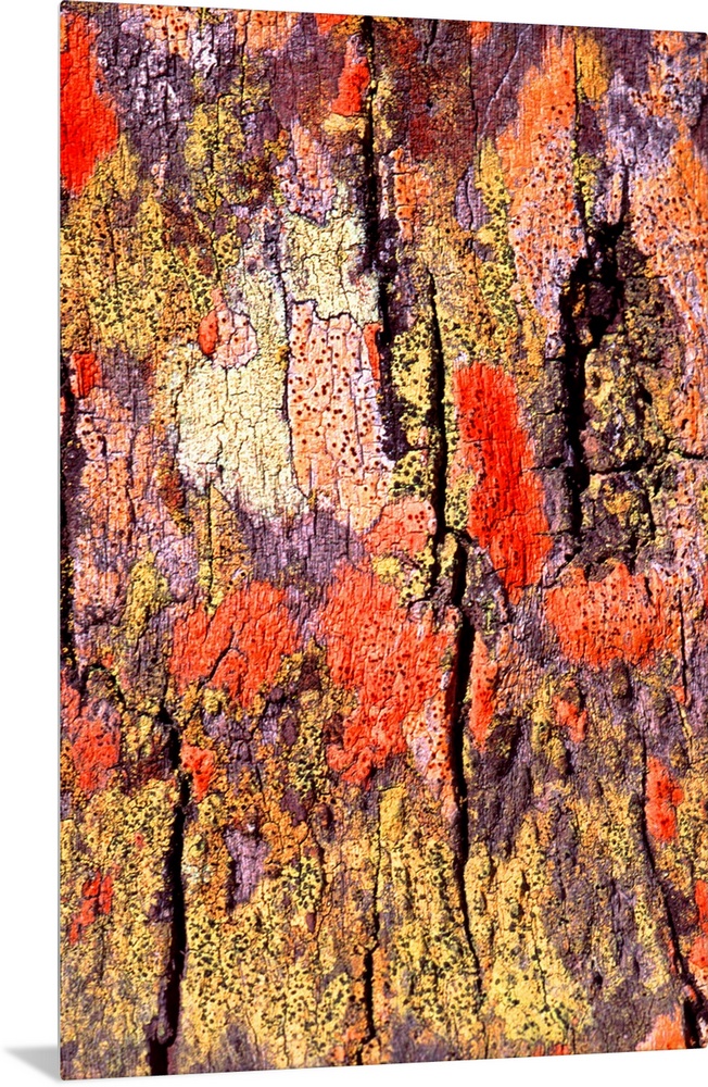 <p>A close up photograph of tree bark with various colors covering the bark.</p>