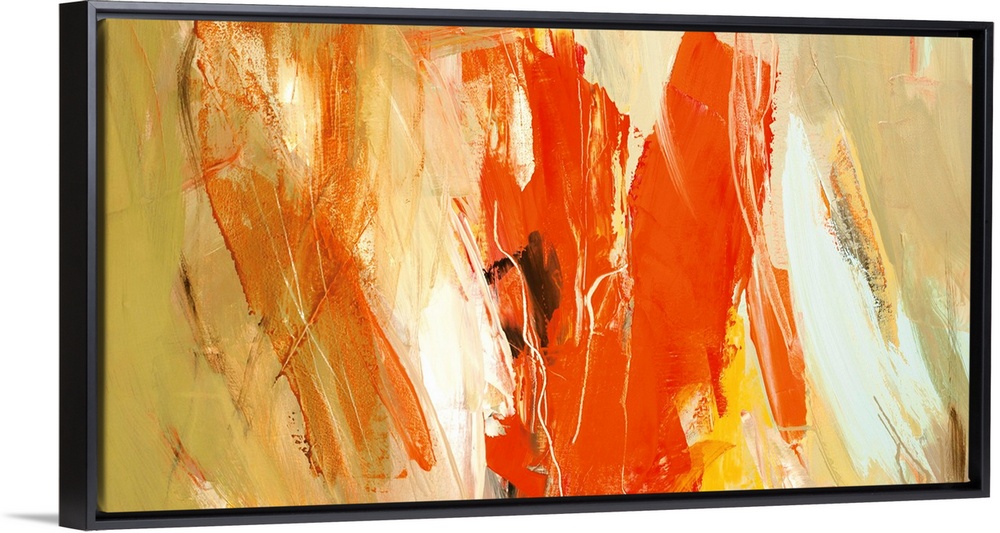 <p>A horizontal abstract painting in vibrant colors of orange, yellow and white.</p>
