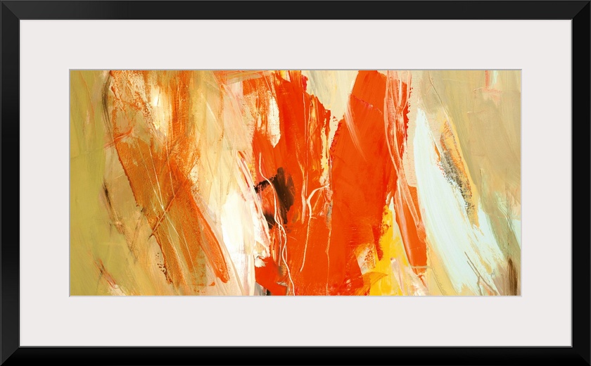 <p>A horizontal abstract painting in vibrant colors of orange, yellow and white.</p>