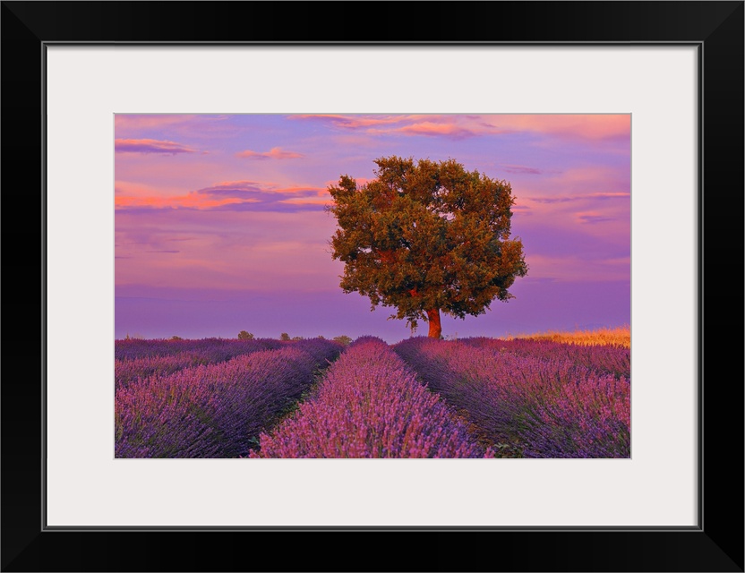 <p>Tree in Lavender Field at Sunset, Valensole Plateau, Alpes-de-Haute-Provence, Provence-Alpes-Cote doAzur, Provence, France</p>