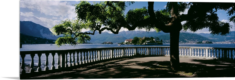 <p>Panoramic photo on canvas of a tree branching out over a view of a lake with rolling mountains in the distance.</p>