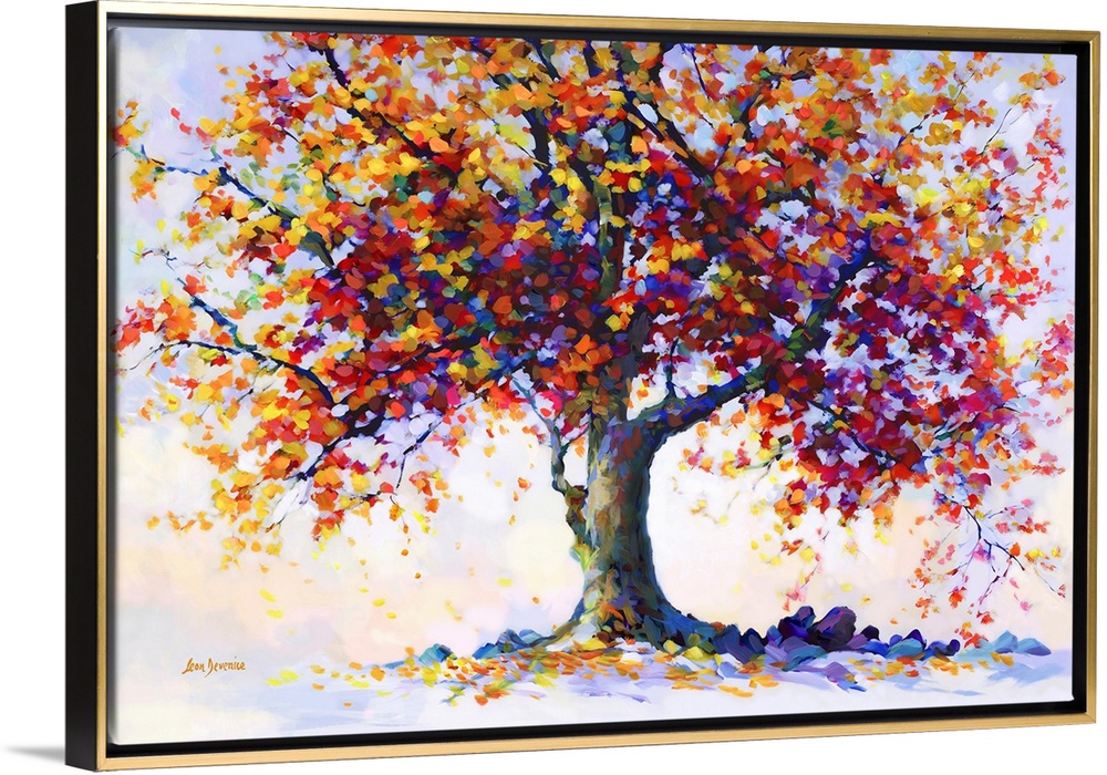 <p>This contemporary landscape brings to life a majestic tree in full autumnal bloom. Its branches are a cascade of warm, fiery colors, each leaf a brushstroke contributing to a stunning visual symphony that captures the heart of the season.</p>