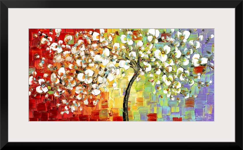 <p>Contemporary painting of a tree with white blossoming flowers on a colorful background creates with red, yellow, green, and purple hues.</p>